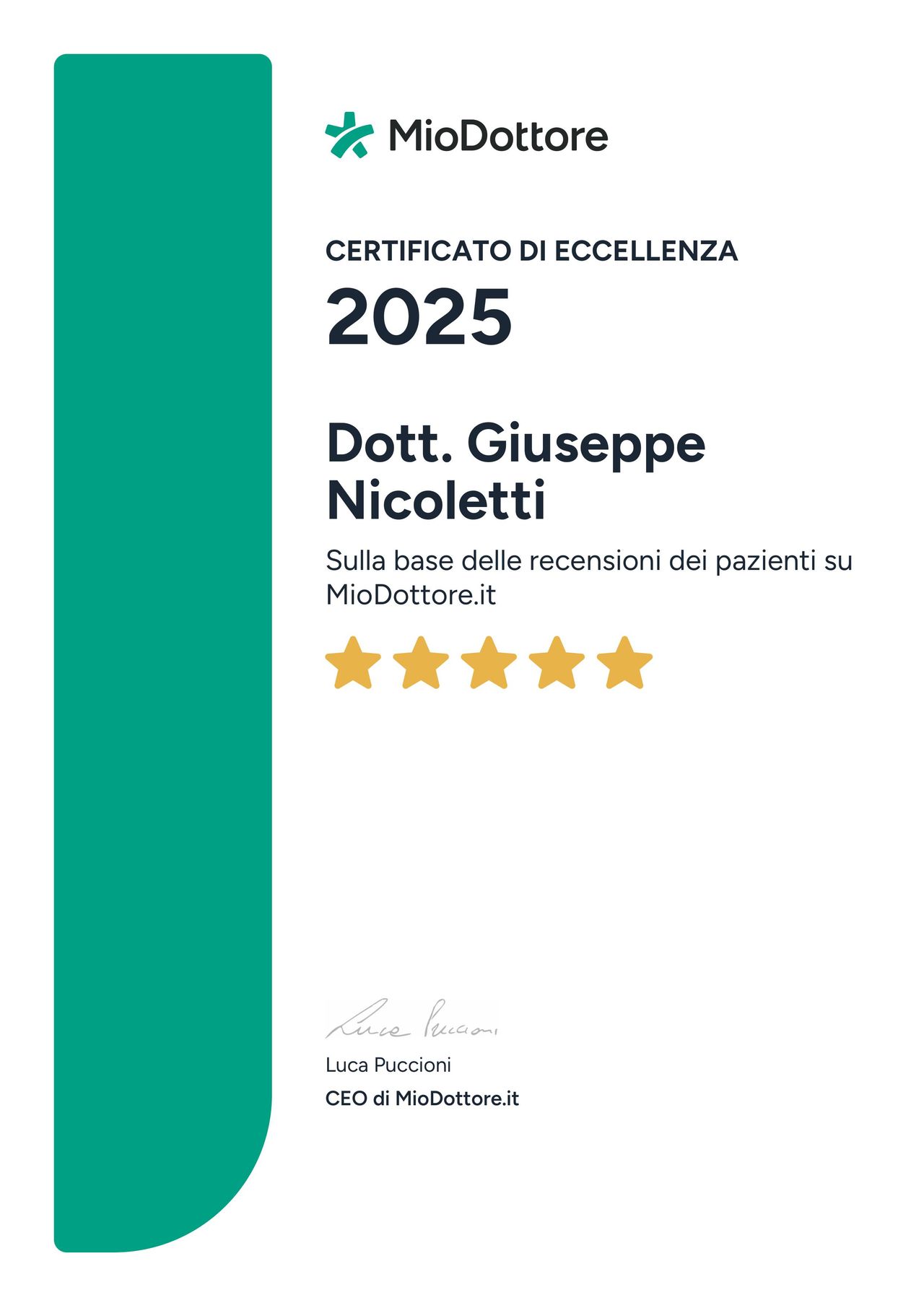"Ottima esperienza. Il Dottor Giuseppe Nicoletti è un professionista serio, preparato e molto cortese. Lo studio è pulito e moderno, e la visita è stata approfondita e puntuale. Molto soddisfatto del trattamento ricevuto dal Dottore, tornerò sicuramente da lui per i prossimi controlli. Cinque stelle meritate!"