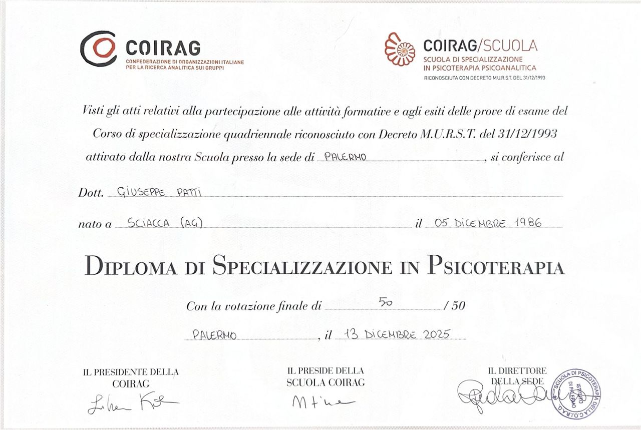 Ho avuto un colloquio con la dottoressa/il dottor Giuseppe Patti e l’esperienza è stata molto positiva. Fin dal primo incontro mi sono sentito/a ascoltato/a e accolto/a, in un ambiente professionale ma allo stesso tempo umano e rassicurante. Lo/la psicologo/a ha dimostrato grande capacità di ascolto, chiarezza nelle spiegazioni e rispetto dei miei tempi. Un incontro utile e costruttivo che mi ha lasciato spunti concreti di riflessione. Consiglio vivamente.