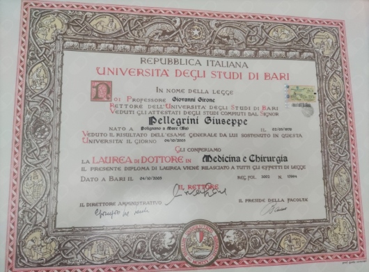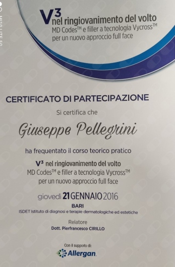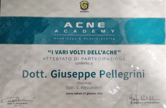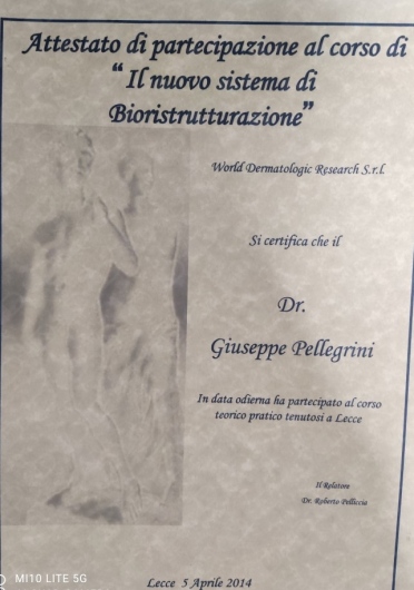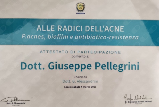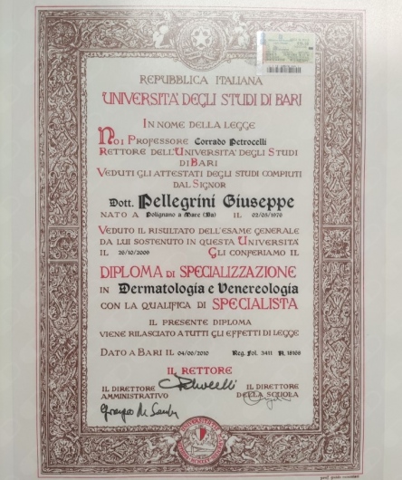Il dr. Giuseppe Pellegrini, titolare dello studio dermatologico sito in Polignano a Mare e dermatologo del centro medico di eccellenza SFERA Medical Group di Brindisi in Puglia, ha conseguito la laurea in Medicina e Chirurgia e si è specializzato in Dermatologia e Venereologia nel 2009, presso l'Università degli Studi di Bari. Ha partecipato attivamente a corsi di formazione in Italia e all'estero, a congressi nazionali ed internazionali in qualità di relatore, a progetti di ricerca finanziati e ad associazioni mediche (SIDeMAST,SIDAPA,ADMG) . Inoltre è autore di nunerosi lavori scientifici presentati a congressi nazionali ed internazionali. Oltre a svolgere la sua professione come dermatologo specialista nel suo studio privato, il dr. Pellegrini svolge attività di specialistica ambulatoriale presso la Asl di Bari.