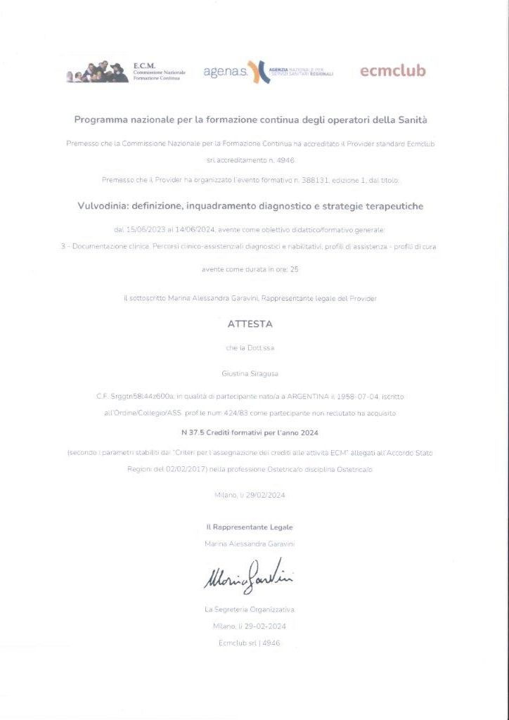 La d.ssa Siragusa e’ una persona con grande preparazione e competenza su problemi intimi femminili. Spiega con chiarezza le soluzioni ai vari problemi . Assolutamente da consigliare.