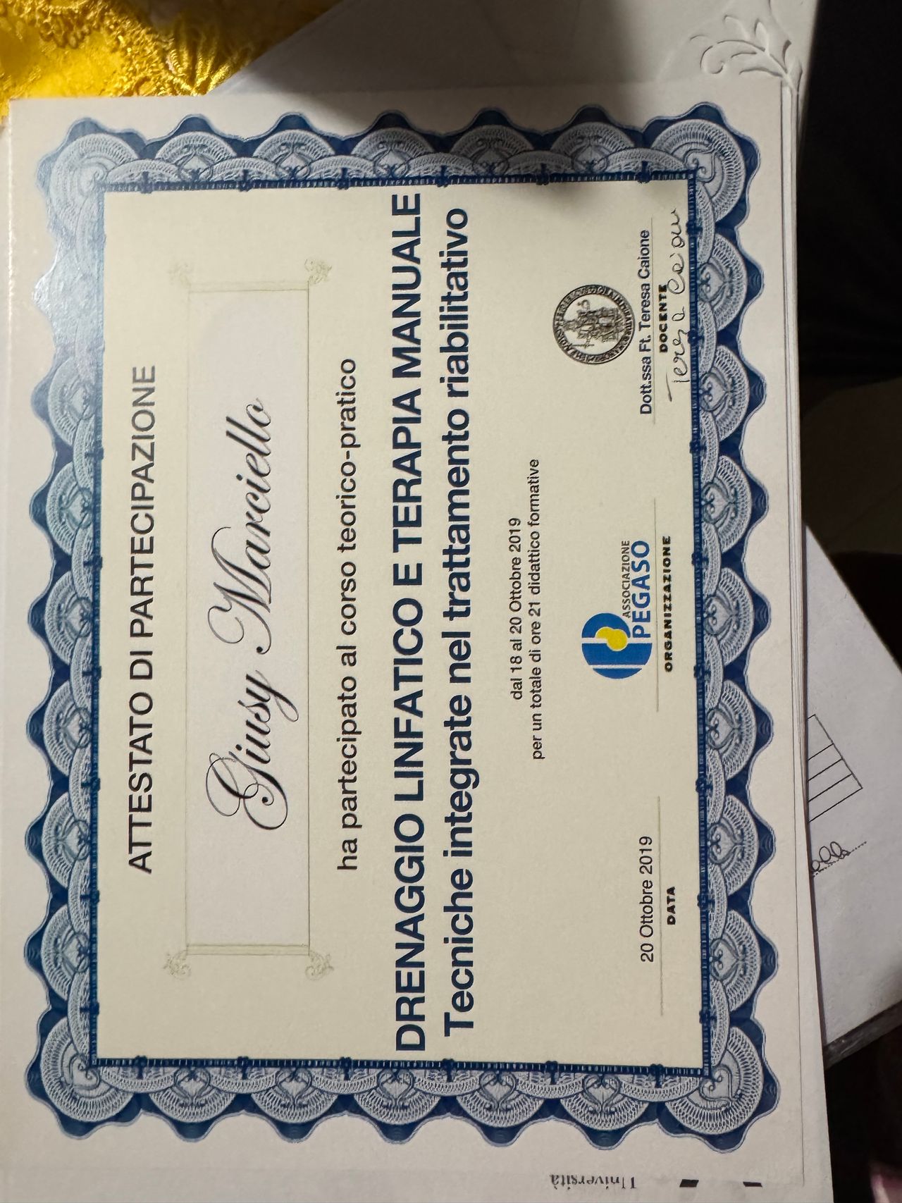 Sono anni che faccio fisioterapia e di terapisti ne ho conosciuti molti, alcuni bravi altri pessimi. Ma quello che inizialmente mi ha colpito in Giusy è la simpatia ed il sorriso che ti ispirano fiducia dal primo incontro. Poi, mi sono resa conto che le mani sono una cosa eccezionale. Giusy è bravissima. In pochi mesi mi ha fatto lasciare i bastoni e mi ha ridato vitalità.