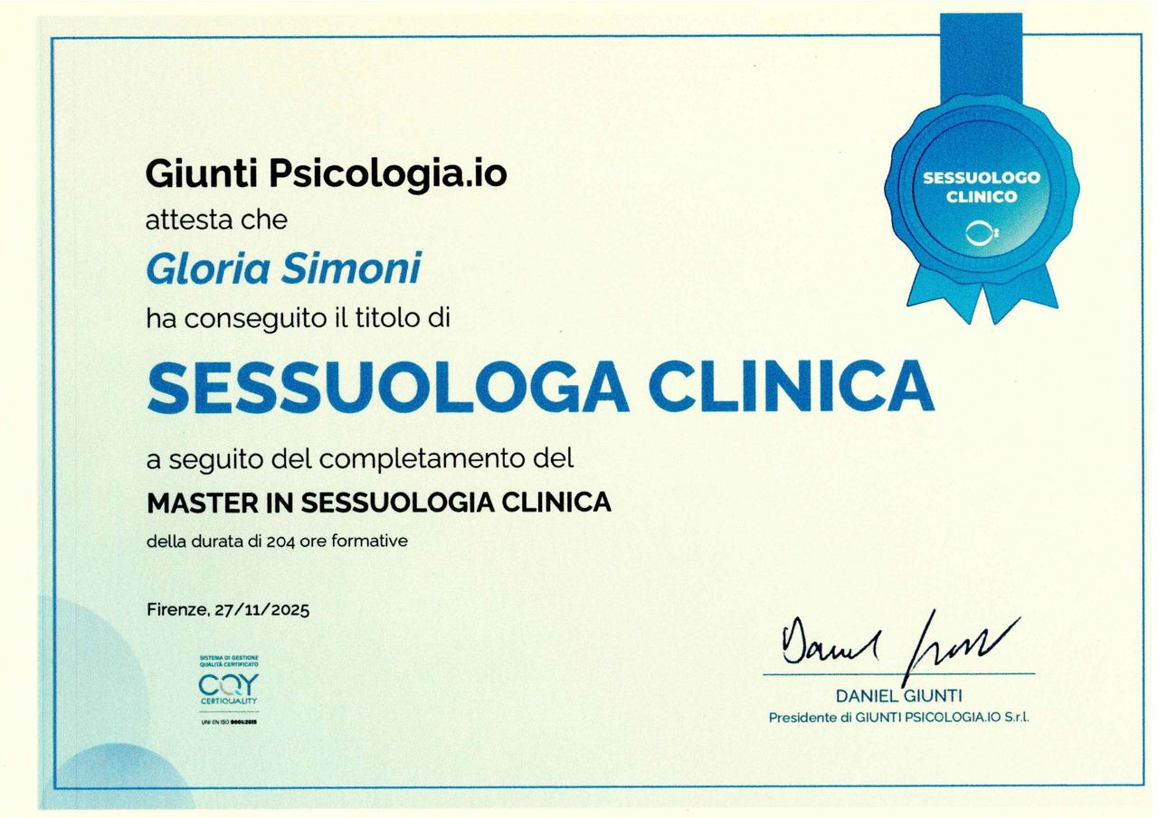 Sono la Dott.ssa Gloria Simoni: Psicologa, Sessuologa, Specializzanda in Psicologia Perinatale e in Psicoterapia Sistemico-Relazionale.