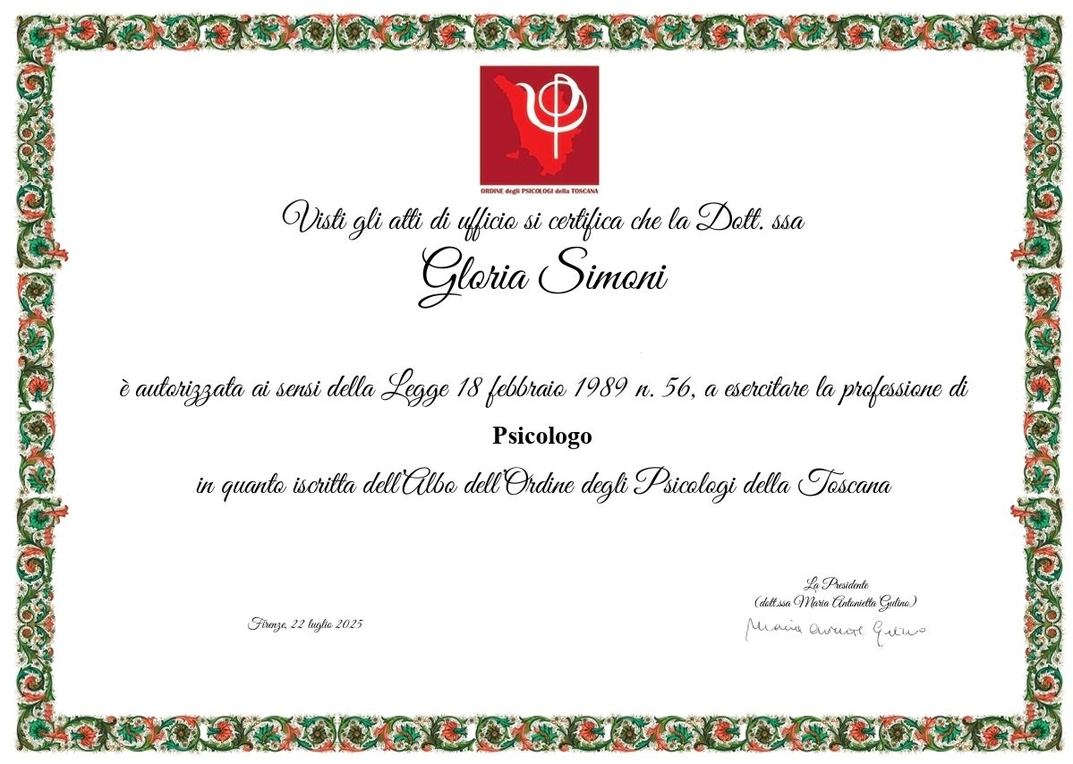 Ho conseguito con lode la Laurea Magistrale in Psicologia Clinica a Roma e, in seguito allo svolgimento del Tirocinio Pratico Valutativo, ho ottenuto l'abilitazione all'esercizio della professione di Psicologa, iscrivendomi all'Ordine degli Psicologi della Toscana (N. 11376).