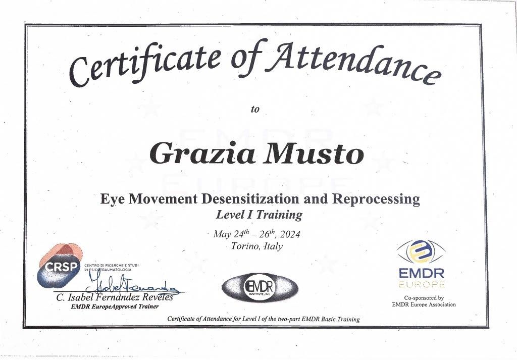 Grazia Musto: psicologa, psicoterapeuta cognitivo comportamentale, terapeuta EMDR e docente di area psicologico-sanitaria in corsi di formazione volti alla riqualificazione professionale.