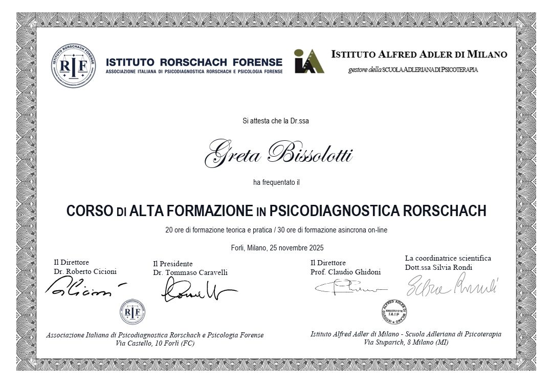 Ho completato una formazione sul Test di Rorschach, strumento che utilizzo quando necessario, in quanto consente un approfondimento più articolato del funzionamento della personalità.