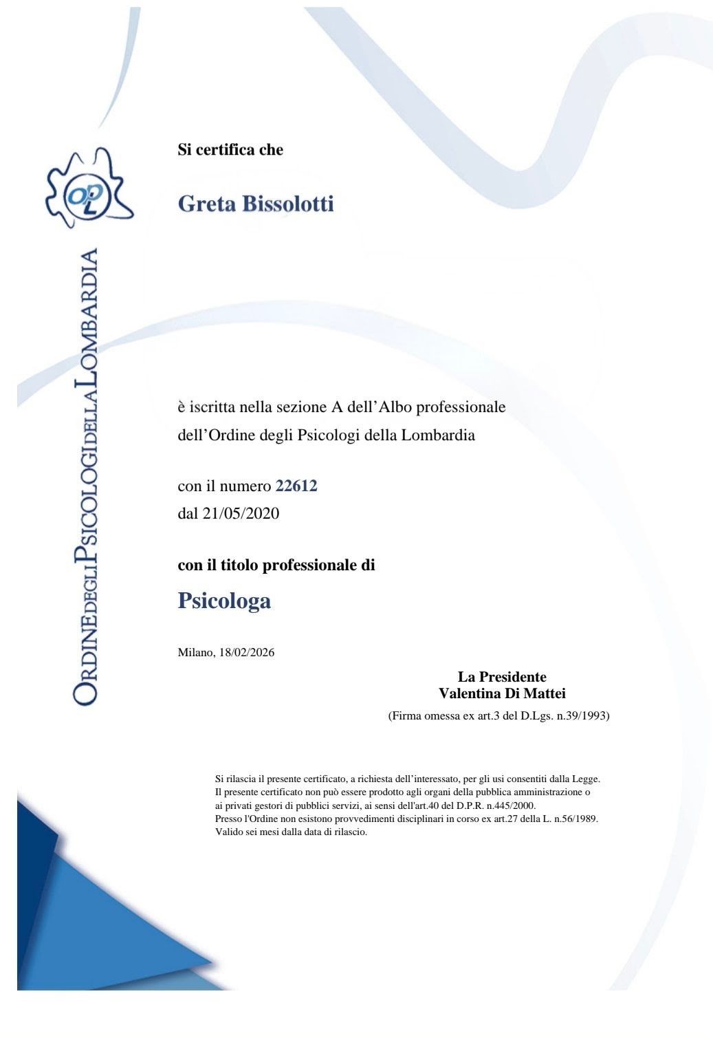 Sono psicologa clinica laureata presso l’Università Cattolica di Brescia e iscritta all’Ordine degli Psicologi della Lombardia con n. 22612.