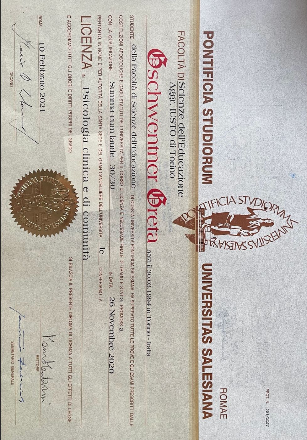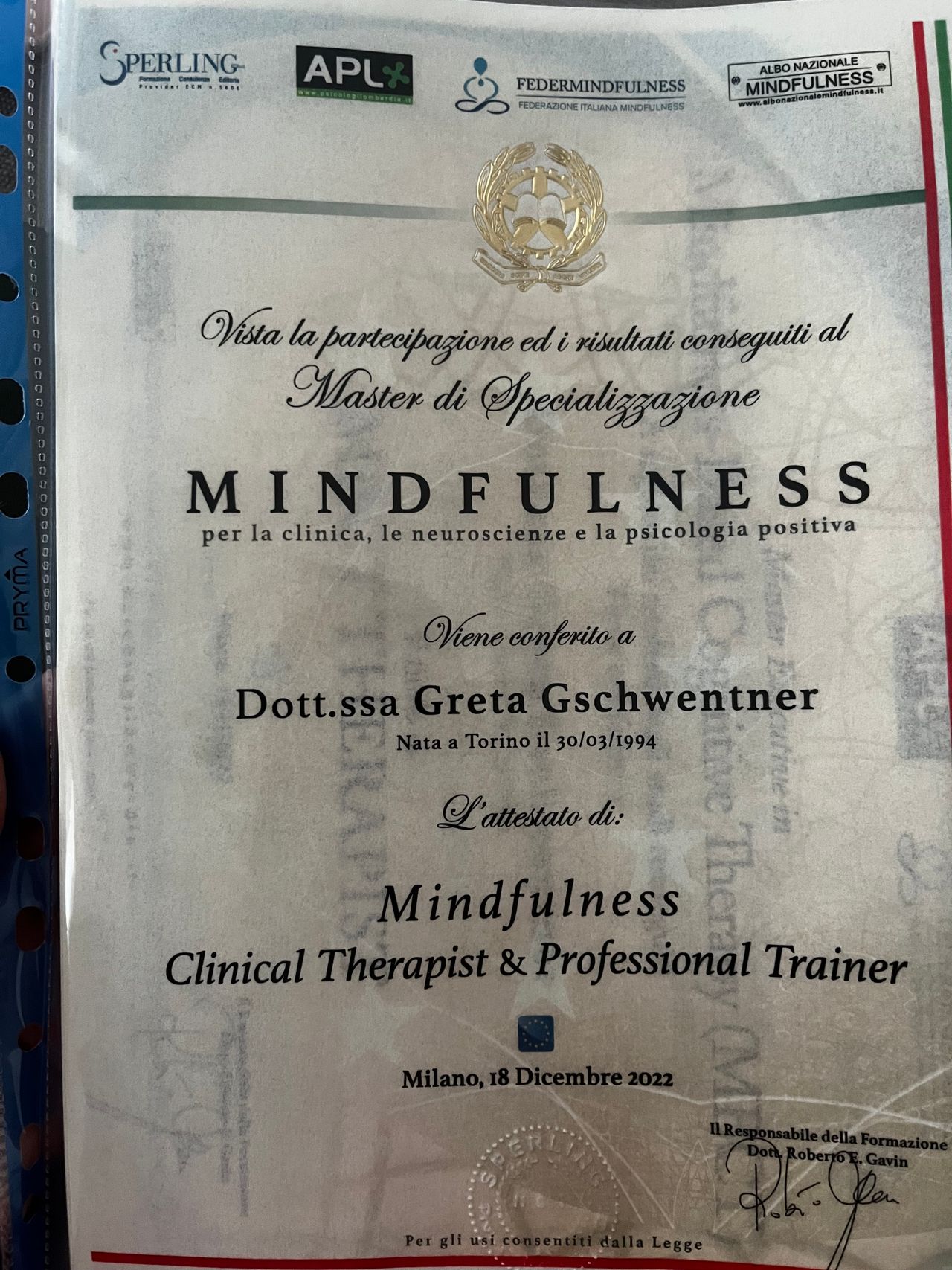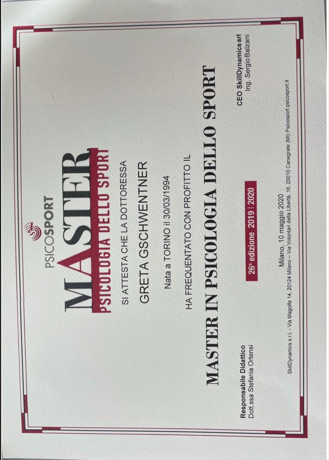 Mi chiamo Greta Gschwentner, sono laureata magistrale a pieni voti in Psicologia Clinica e di Comunità ed abilitata alla professione di Psicologa. Ho conseguito con profitto, in itinere , un Master di specializzazione in Psicologia dello Sport, riconosciuto a livello nazionale e mi sto specializzando in Psicoterapia ad indirizzo psicosomatico.