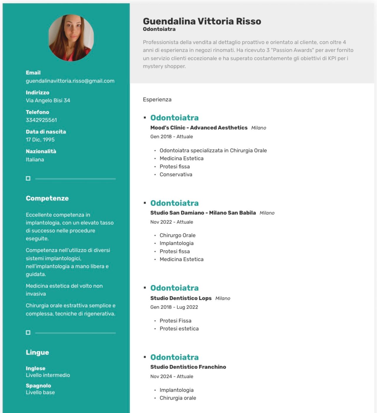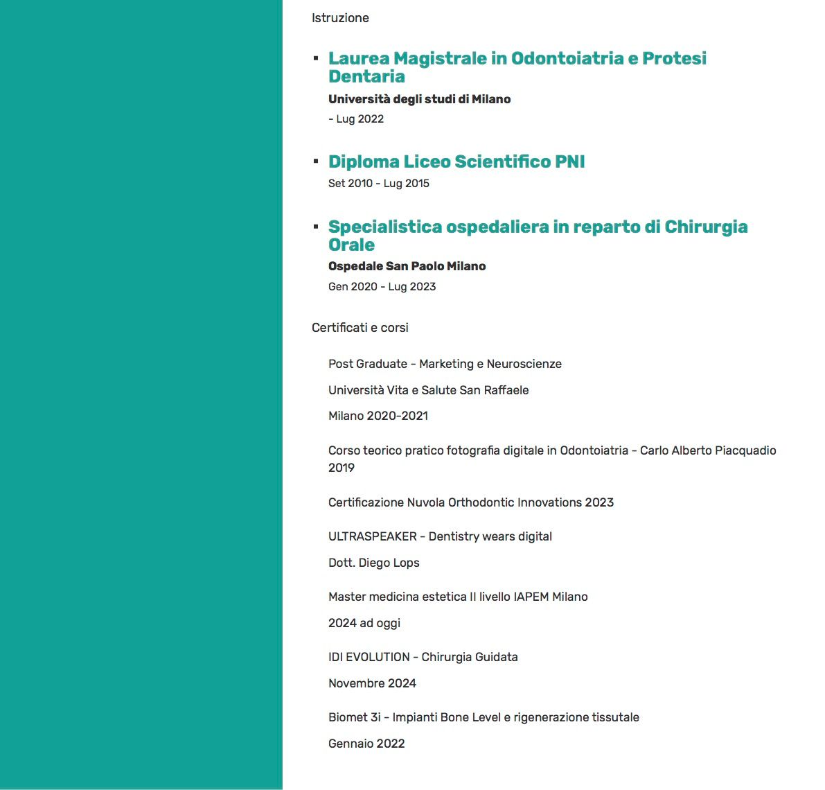 Odontoiatra specializzata in Chirurgia Orale e Implantologia, Laureata a pieni voti all’Universita degli studi di Milano - Polo San Paolo.