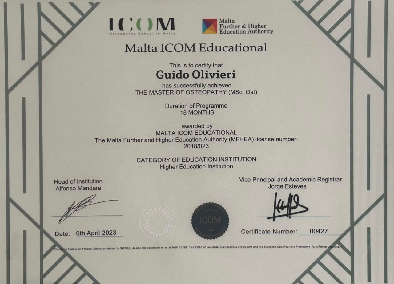 Sono Guido Olivieri e lavoro dal 2022 come osteopata presso lo studio Spazio GO in via Murat 8 (MI). Ho conseguito la laurea presso l'International Collage of Osteopathic Medicine (ICOM) e una doppia specializzazione in ambito pediatrico e ostetrico nel 2022 e nel 2025.
