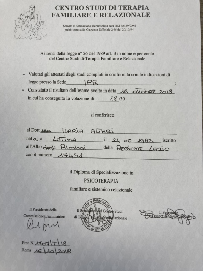 Ho intrapreso con la dottoressa Altieri un percorso individuale di psicoterapia. Professionista di grande empatia, professionalità e accoglienza. Con lei mi sono sempre sentita a mio agio anche nei momenti più delicati e difficili della terapia, mi sono sentita accolta e mai giudicata. Consiglio vivamente.