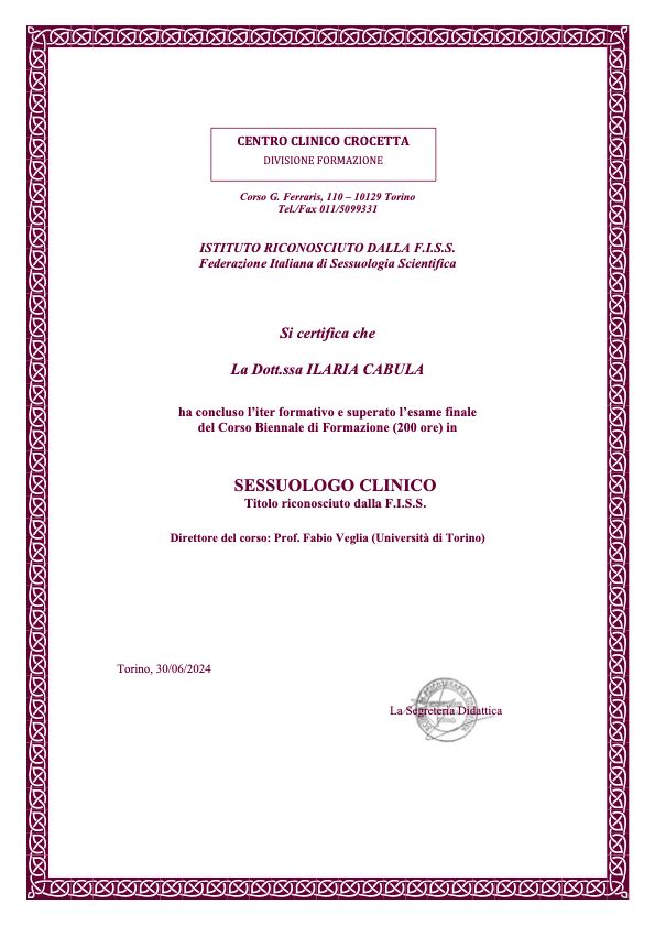 Sono la Dott.ssa Ilaria Cabula, psicologa a orientamento cognitivo-costruttivista, terapeuta EMDR e sessuologa clinica. Mi occupo di traumi, difficoltà relazionali, sessualità, benessere femminile e sostegno nei momenti critici della vita.