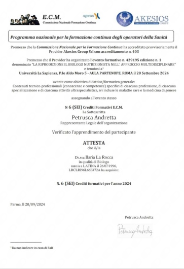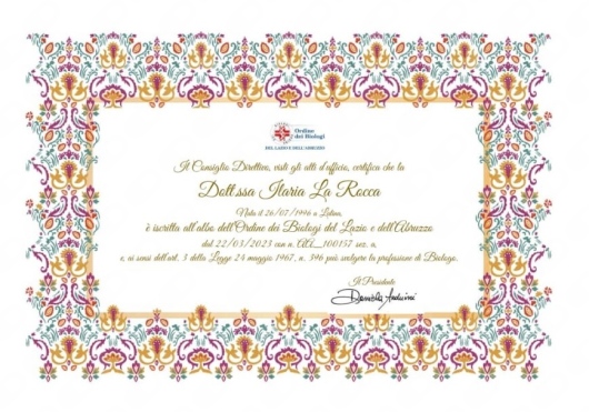 Ho conseguito la Laurea triennale in Scienze Biologiche presso l'Università degli Studi della Tuscia e la Laurea Magistrale in Scienze della Nutrizione Umana presso l'Università degli Studi di Roma Tor Vergata con votazione finale di 110/100 e Lode.