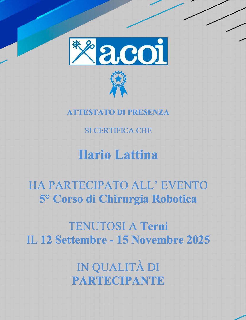 Ciao! Ho svolto la mia formazione specialistica chirurgica presso numerosi ospedali Romani (IFO, San Giovanni - Addolorata, Policlinico Umberto I, Fatebenefratelli - San Pietro) ed a Milano (Fondazione IRCCS Ca' Granda Ospedale Maggiore Policlinico). Attualmente lavoro come Dirigente Medico presso l'Aurelia Hospital di Roma ed ho come campi d'interesse la coloproctologia benigna e maligna, la chirurgia delle ernie e dei laparoceli in laparoscopia e con tecnica tradizionale, la chirurgia mini-invasiva della colecisti, la chirurgia oncologica addominale, con particolare attenzione all'aspetto mininvasivo laparoscopica e robotico, e la chirurgia ambulatoriale, come asportazione di nevi, di cisti e di neoformazioni cutanee/sottocutanee.
