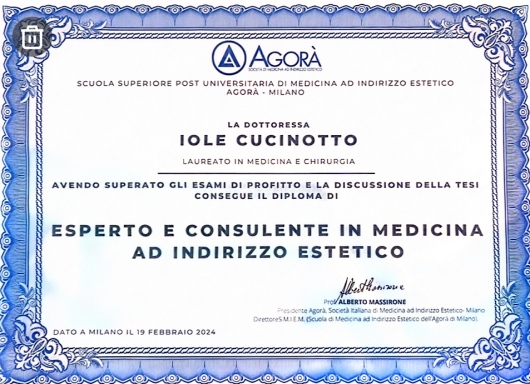 Durante gli anni in azienda farmaceutica sono entra nella prestigiosa Scuola di Medicina Estetica Agorá SMIEM, sita a Milano, dove ho conseguito il titolo di Consulente Esperto in medicina estetica con lode.