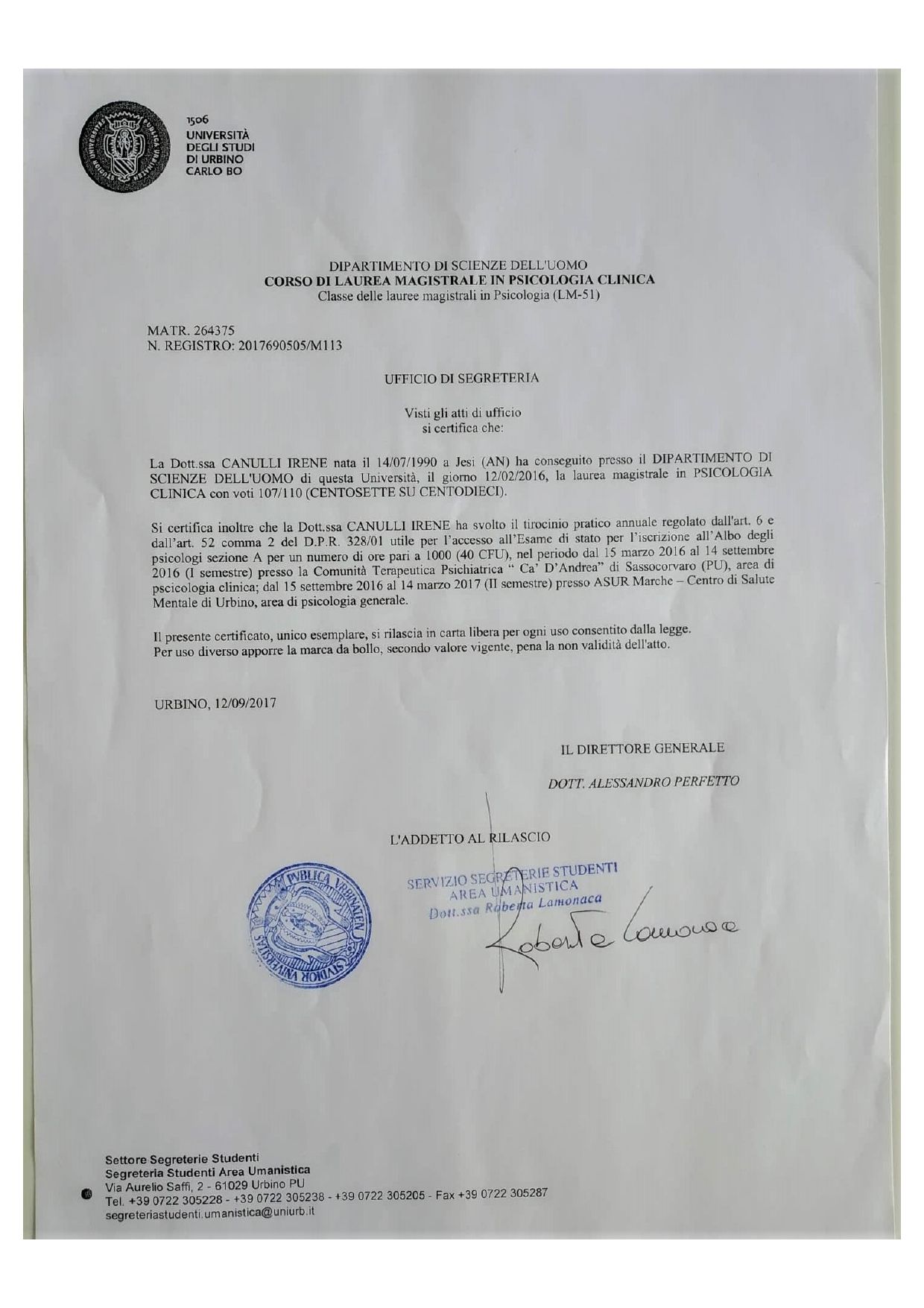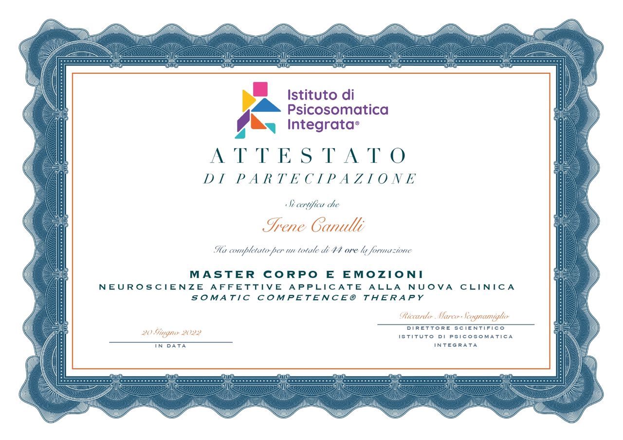 Mi sono laureata in Psicologia Clinica presso l’Università degli Studi di Urbino nel 2016. Ho approfondito un approccio che integra mente e corpo conseguendo nel 2022 il Master in Somatic Competence Therapy presso l’Istituto di Psicosomatica Integrata di Milano e nel 2023 mi sono formata come Facilitatrice Mindfulness presso Mindfulness Educators di Firenze. Attualmente frequento il terzo anno della Scuola di Specializzazione in Psicoterapia presso l’Università degli Studi di Torino.