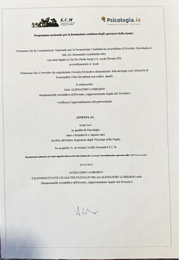 E’ la mia terza psicoterapeuta nell’arco di un anno…..davvero eccellente professionista, grande disponibilità e forte empatia, un enorme aiuto nel portarmi fuori dal mio malessere. Grazie