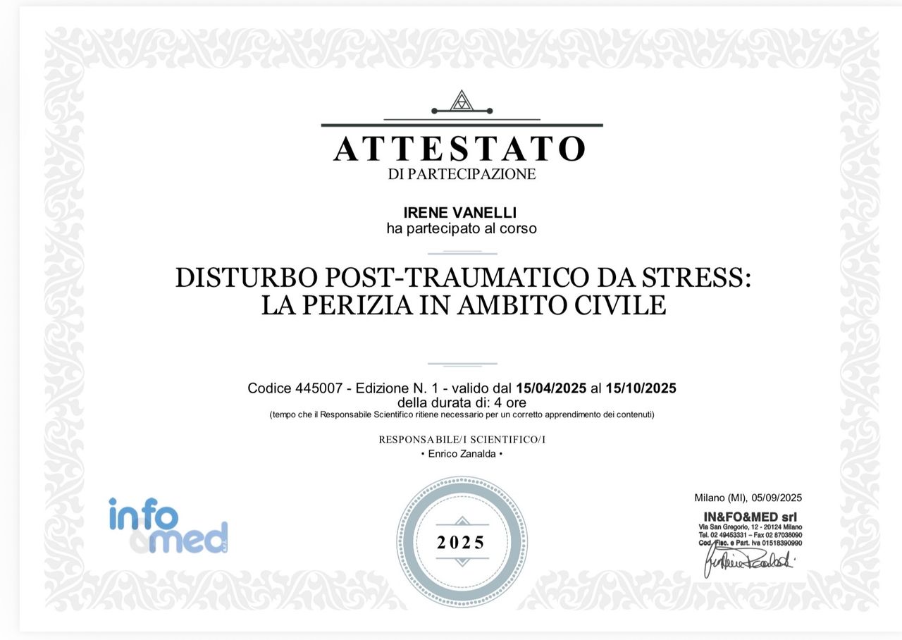 La mia formazione include anche un percorso in psicoterapia, che mi ha permesso di sviluppare una maggiore sensibilità nella comprensione dei vissuti emotivi e dei meccanismi psicologici che generano dolore, pur concentrando il mio intervento sul trattamento farmacologico.