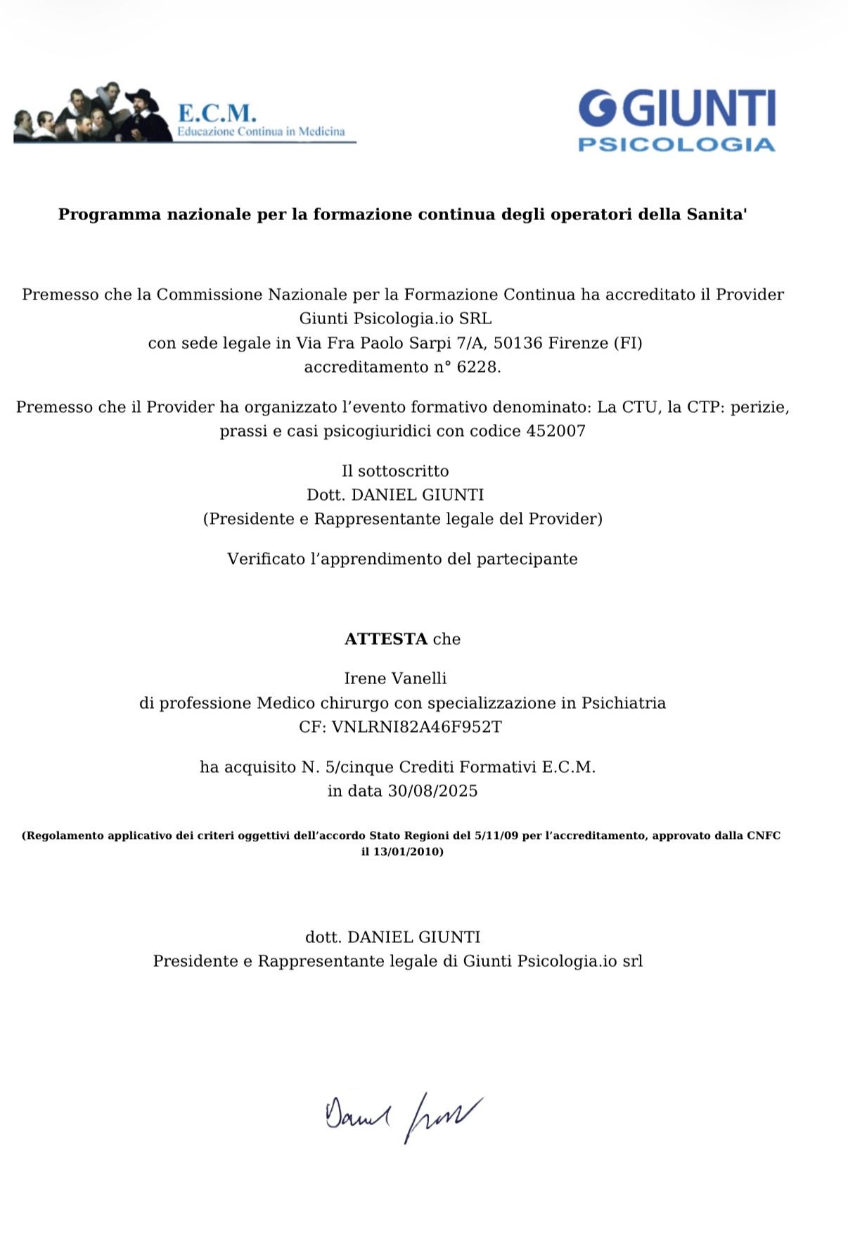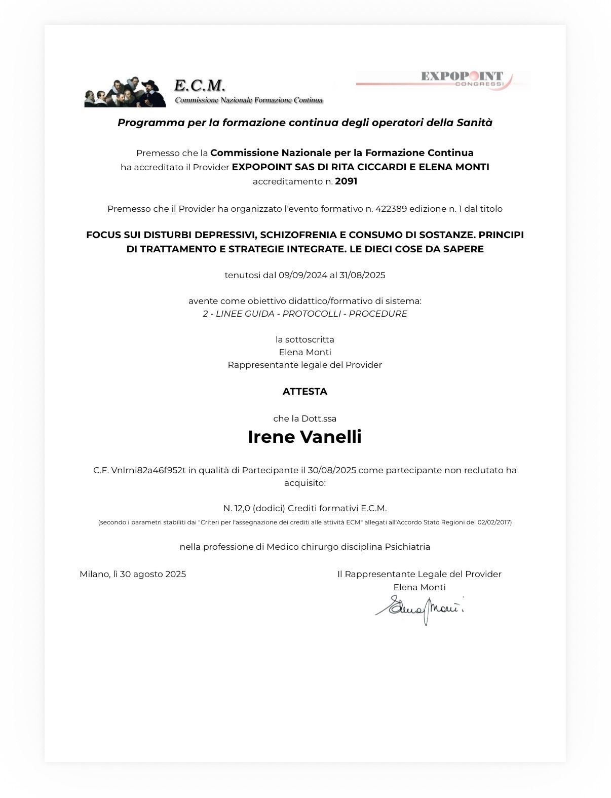 Sono molto soddisfatto del lavoro svolto dalla dottoressa Vanelli.