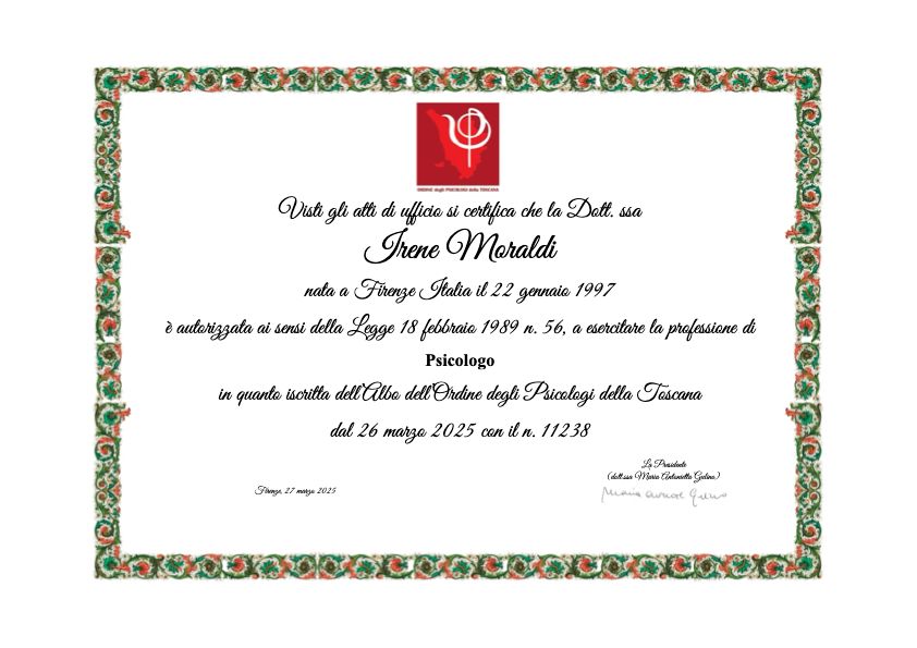 Mi sono laureata in Psicologia Clinica e della Salute all’Università di Firenze con votazione 110/110 e lode, sono iscritta all’Ordine degli Psicologi della Toscana (n. 11238) e sono attualmente specializzanda in psicoterapia con orientamento costruttivista-intersoggettivo.