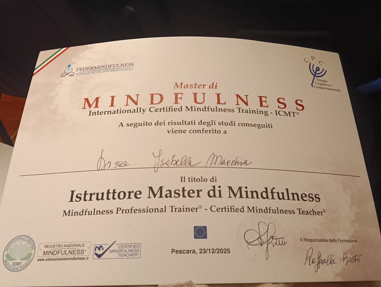 Sono anche un' istruttrice mindfulness, pratico questa tecnica per insegnare ai pazienti a vivere nel presente senza giudicarsi con lo scopo di condividere tutti gli strumenti di mia competenza per aiutare a superare ogni tipo di disagio e/o disturbo psicologico.