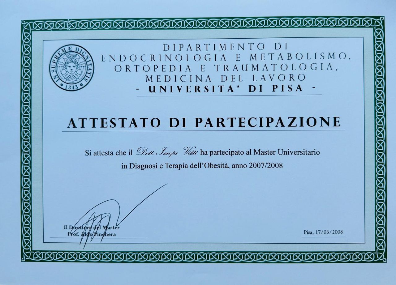 Dopo lo svolgimento di un dottorato nel 2006, impegnato in un progetto di ricerca inteso a migliorare la composizione lipidica degli alimenti, si è dedicato alla nutrizione clinica. Nel 2007 ha conseguito un master in diagnosi e terapia dell’obesità e nel 2008 una borsa di studio presso il Centro Obesità di Endocrinologia dell’Università di Pisa, dove al momento svolge la sua attività di ricerca. Si dedica principalmente al trattamento dietetico-comportamentale del soggetto sovrappeso o obeso e al controllo nutrizionale del paziente sottoposto a chirurgia bariatrica, sia nella fase di preparazione all’intervento che al successivo monitoraggio. Partecipa inoltre a numerosi progetti di studio dedicati alla prevenzione dell’obesità nonché alla divulgazione di un