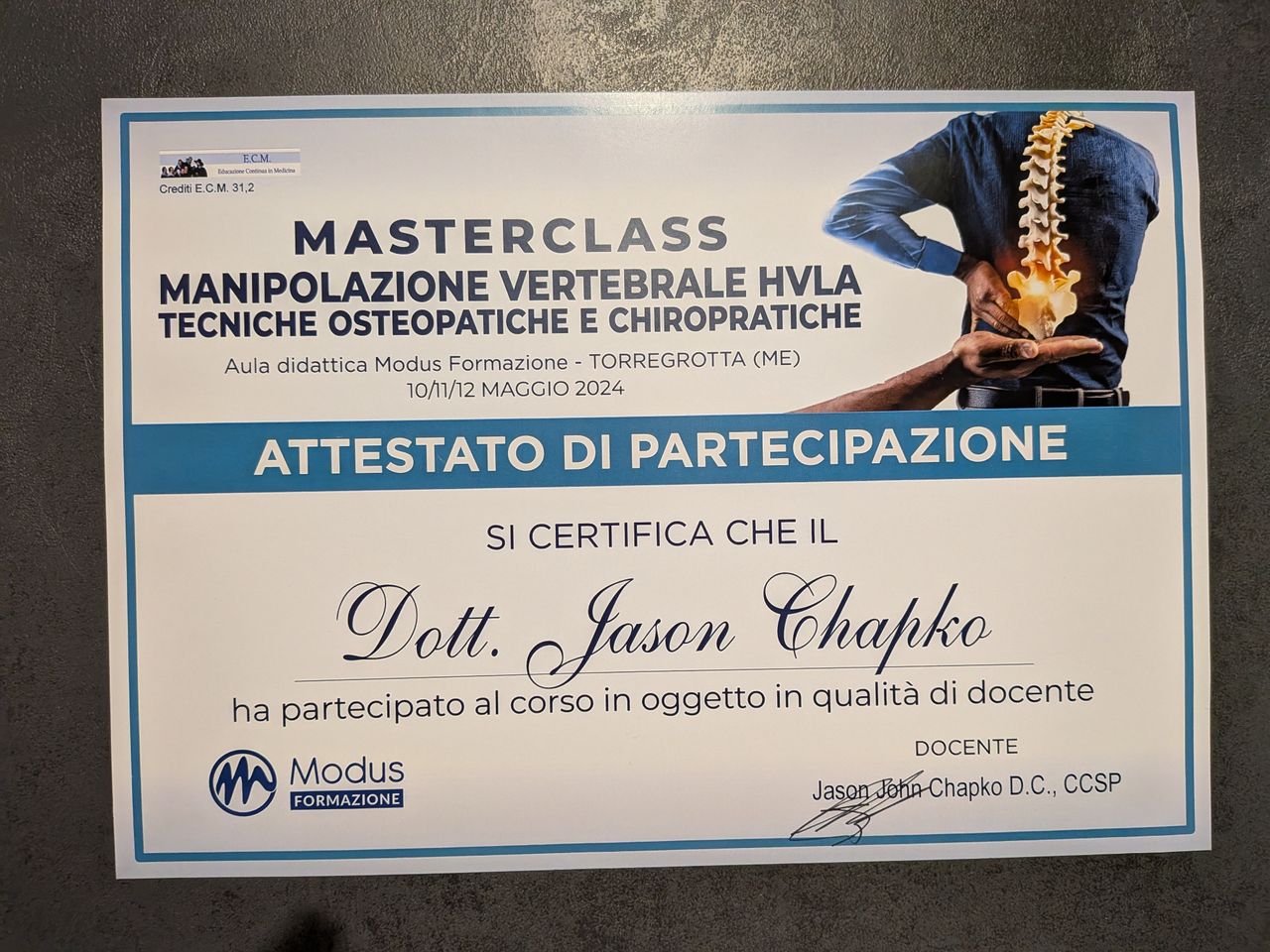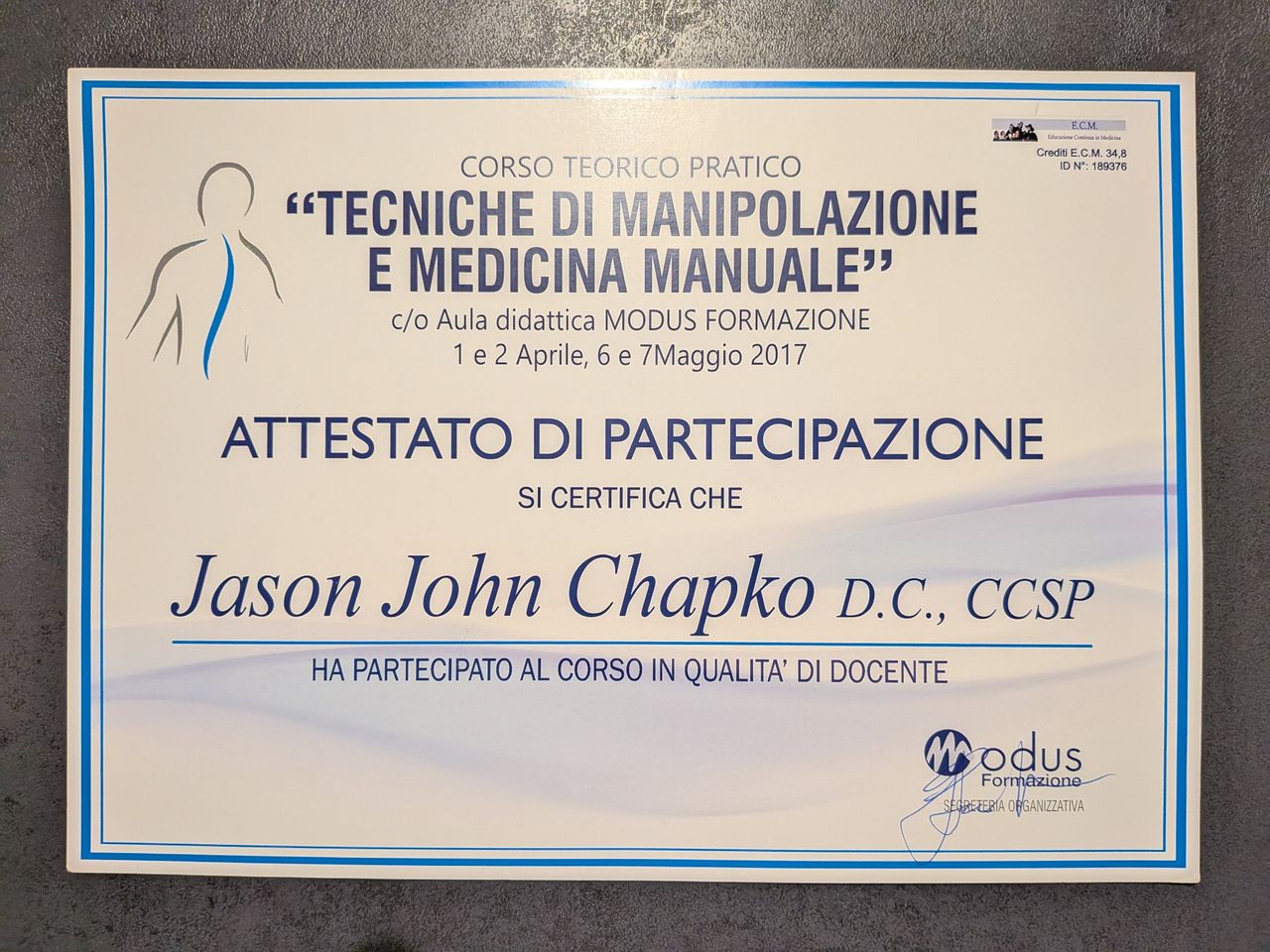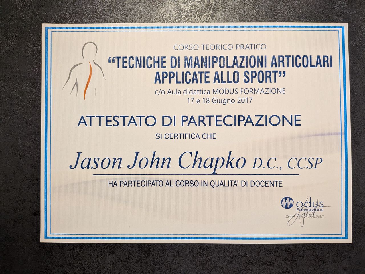 Nel corso degli anni si specializza in tecniche miofasciali, manipolazione delle estremità, kinesiology taping e si certifica come chiropratico dello sport presso il Northwestern Health Sciences University (Minneapolis, USA).