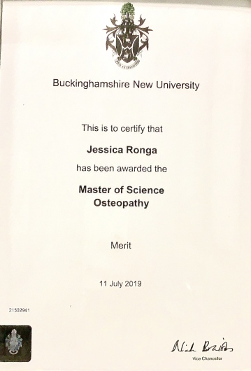 Diplomata presso l’Istituto Superiore di Osteopatia (Milano), prima scuola di Osteopatia in Italia. Laureata presso la Buckingamshire New University of London.