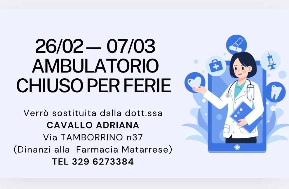 Si avvisano i gentili pazienti che l’ambulatorio resterà chiuso per ferie dal 26 FEBBRAIO AL 7 MARZO.