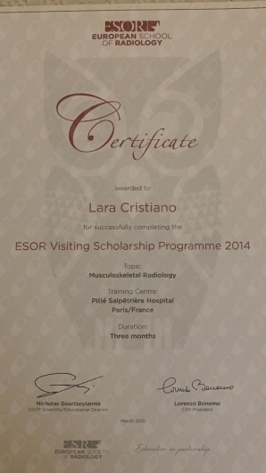 Vincitrice della Fellowship della Società Europea di Radiologia (ESR/ESOR) presso l’Hôpital Universitaire Pitié Salpêtrière di Parigi.