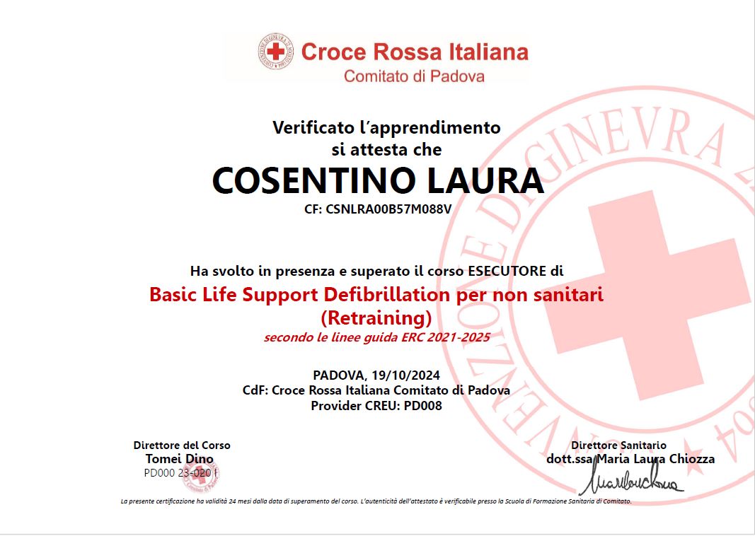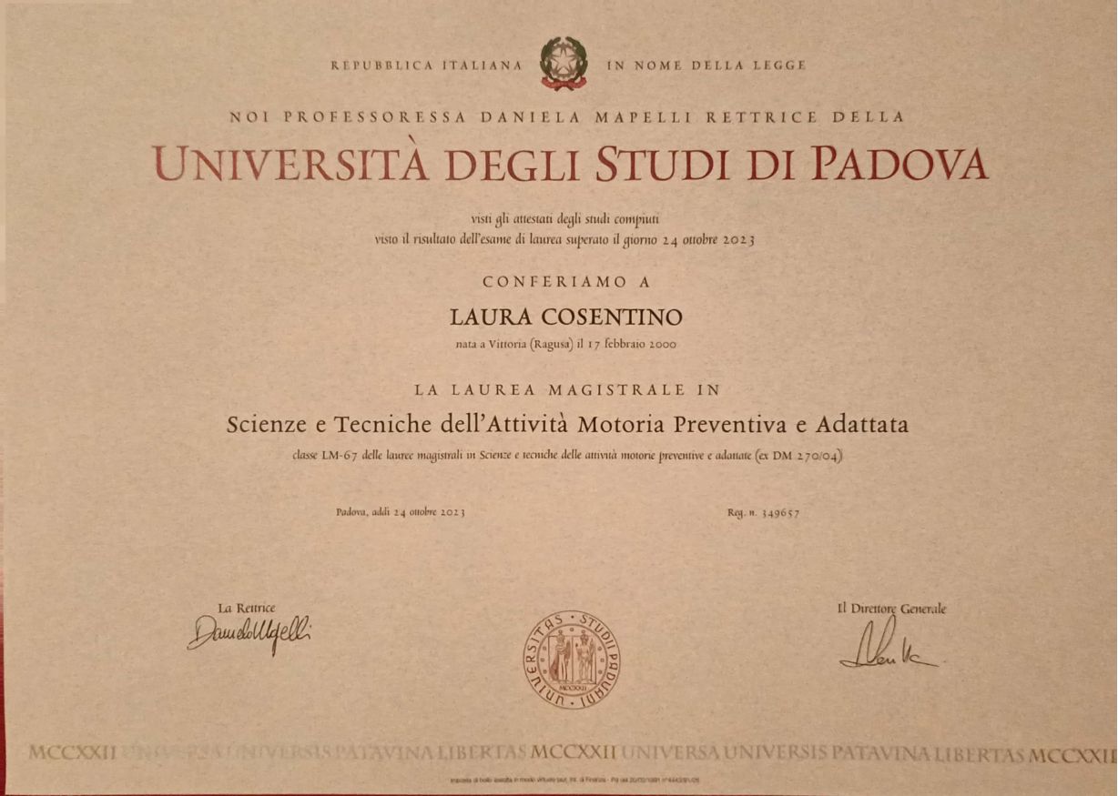 Laurea Magistrale LM67 - Scienze e Tecniche dell'Attività Motoria Preventiva e Adattata - Conseguita presso l'Università degli Studi di Padova il 24/10/2023
