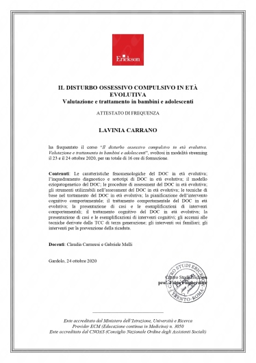 Ho approfondito la mia conoscenza con un Master Universitario di II livello, concluso con lode, presso l'Università Europea di Roma, focalizzato sui meccanismi fisiologici del sistema nervoso. Attualmente, sono al IV anno della mia formazione come Psicoterapeuta Cognitivo Comportamentale Integrata presso il Consorzio Universitario Humanitas.