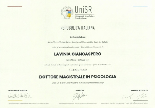 Ho conseguito la laurea in Psicologia all'Università Vita-Salute San Raffaele nel 2022, in seguito ho svolto il tirocinio post-lauream presso il dipartimento di Psicopatologia dello Sviluppo dell'Ospedale San Raffaele Turro.