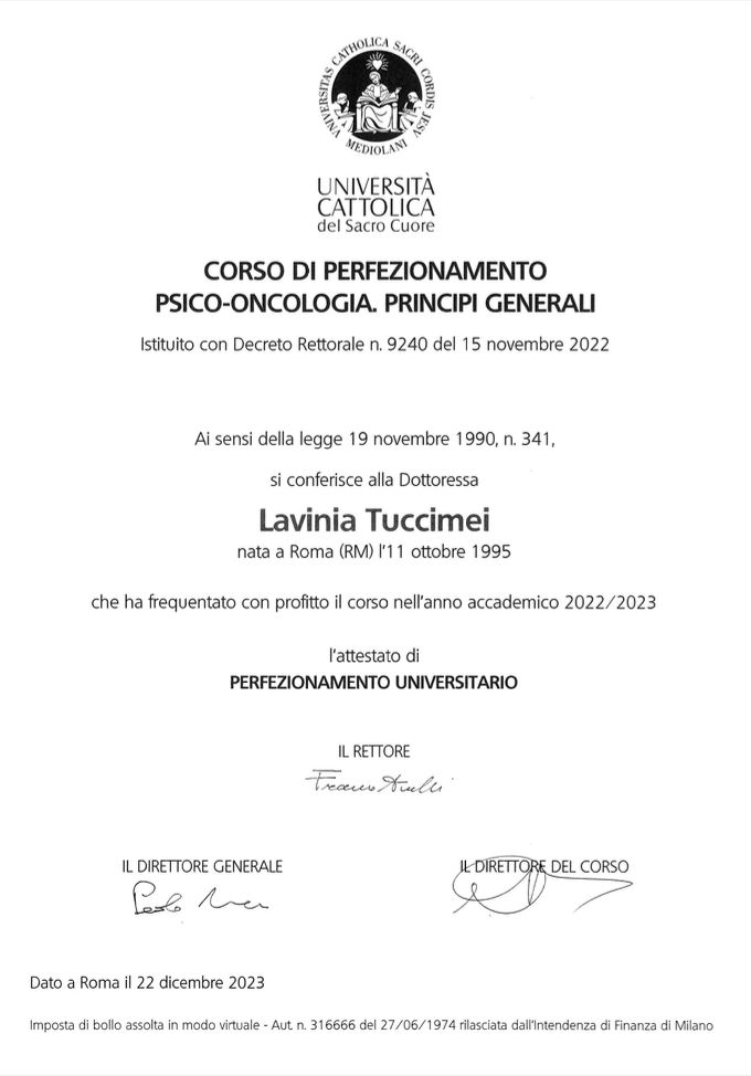 Sono Lavinia Tuccimei, psicologa specializzata in psiconcologia.