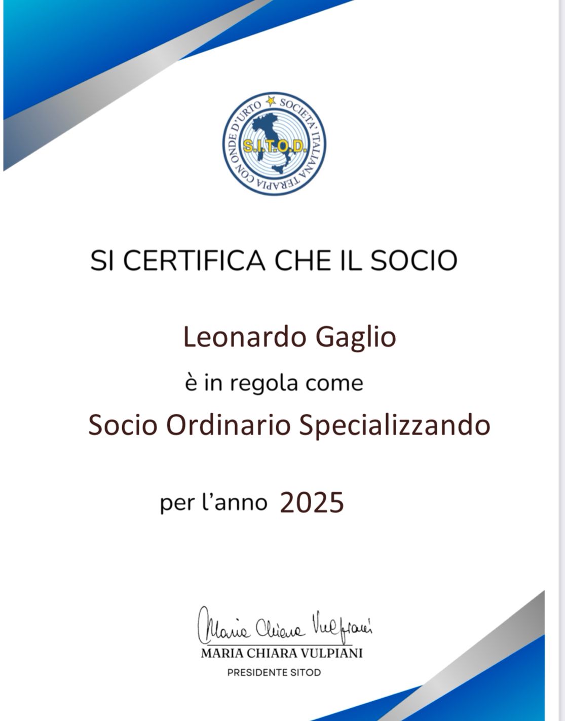 Sto facendo in questo periodo la terapia di onde d'urto al trocantere, ho appezzato molto la gentilezza , e la disponibilità del Dottore all'ascolto ,Sono molto soddisfatta, Grazie Dottor Gaglio Leonardo .