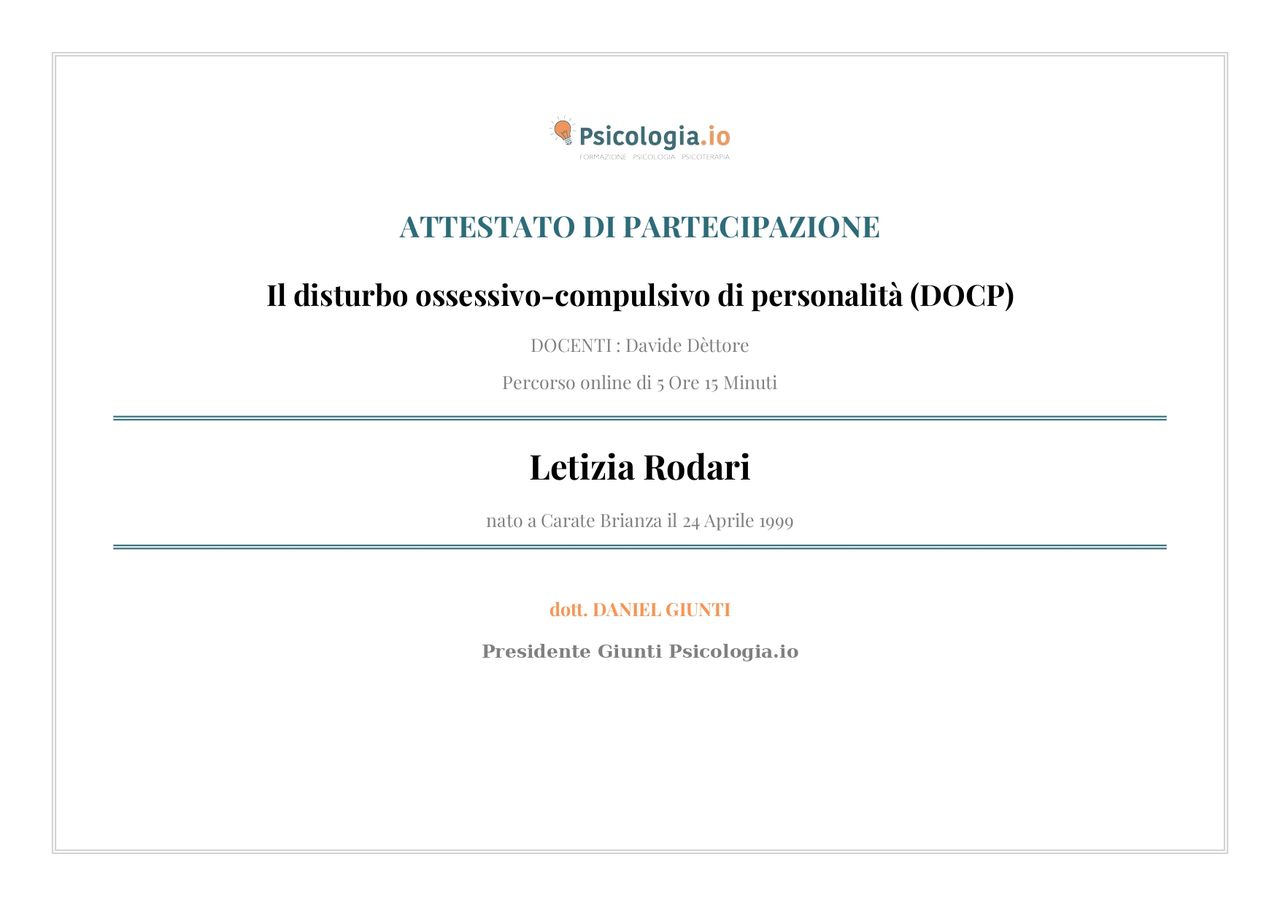 Consiglio vivamente la Dott.ssa Rodari per l'attenzione, l'ascolto, la scrupolosità e la passione che in ogni seduta mostra nello svolgere la propria professione e la ringrazio per tutti i risultati che abbiamo raggiunto e stiamo raggiungendo in questo percorso psicologico.