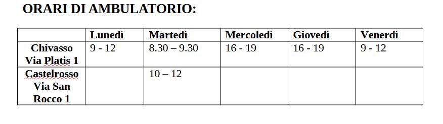 • Segreteria: dal 01/07/25 sarà presente una segretaria negli orari di ambulatorio che si occuperà di ricette, registrazione referti, appuntamenti e informazioni varie.