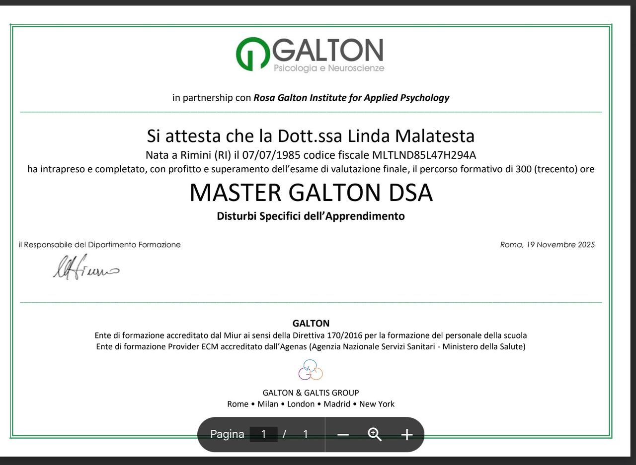 Abbiamo conosciuto la Dott.ssa Malatesta in un momento delicato per nostro figlio, e fin dal primo incontro ci siamo sentiti accolti e compresi. La sua professionalità, unita a una grande dolcezza e capacità di entrare in sintonia con i bambini, ha fatto davvero la differenza. Nostro figlio si è sentito subito a suo agio, cosa per nulla scontata, e abbiamo visto progressi concreti nel suo comportamento e nel suo benessere emotivo già dopo poche sedute. La Dottoressa è sempre stata disponibile anche per confronti con noi genitori, fornendoci strumenti utili per affrontare al meglio alcune situazioni quotidiane. Una professionista competente, attenta e umana. Consigliatissima a chi cerca un supporto serio e sensibile per il proprio bambino.