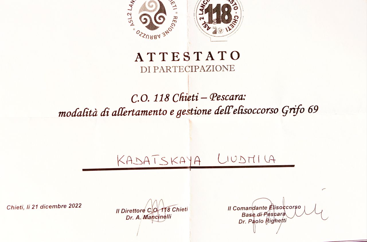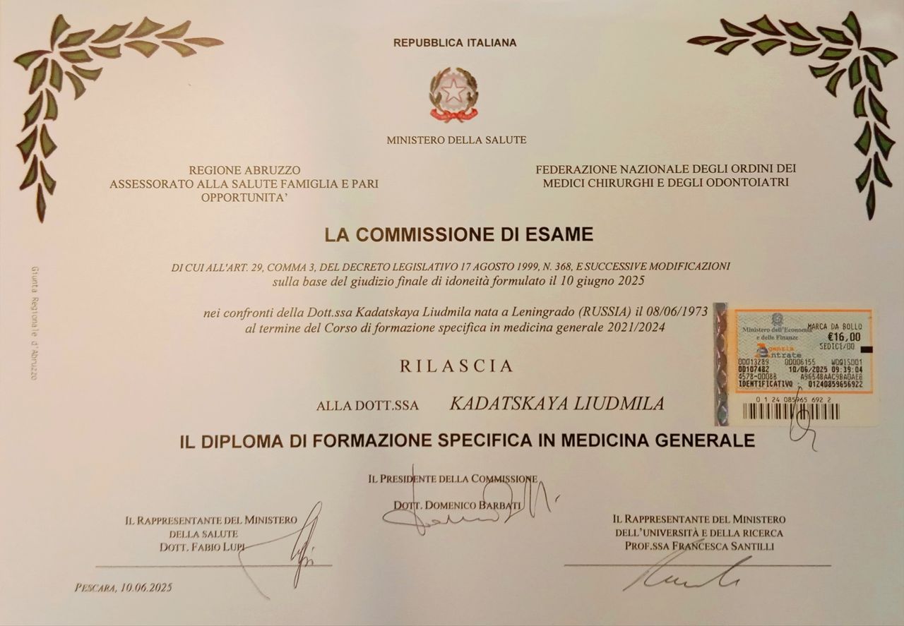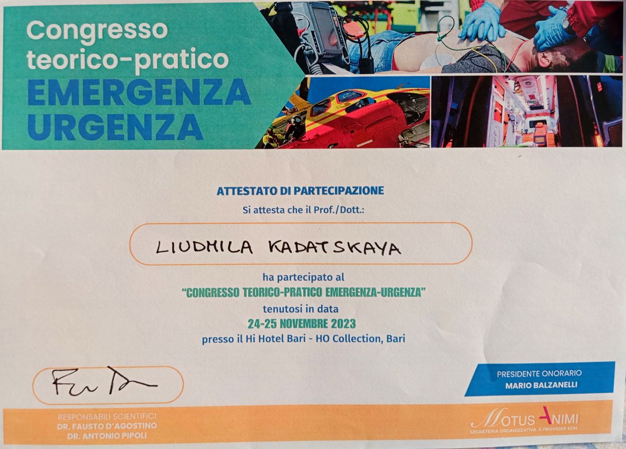 Laurea in Medicina Pediatrica presso "Università statale di Medicina pediatrica di San Pietroburgo" 1996 Specializzazione in Pediatria 1997 , Specializzazione in Laboratorio analisi cliniche e diagnostica di laboratorio 1998 MAPO SPb, Laurea in Medicina e Chirurgia presso Università di Roma "La Sapienza" 2009. Abilitazione alla professione medica presso Università di Chieti febbraio 2010 . L' iscrizione OMCEO di Pescara marzo 2010 (N°3999). 2010-2016 Medico presso il Servizio di Continuità Assistenziale ASL 2 Abruzzo, 2017-2024 Medico presso il Servizio di Emergenza Sanitaria Territoriale ASL 2 Abruzzo. Dal 2024 Medico di Medicina Generale, ASL Pescara.