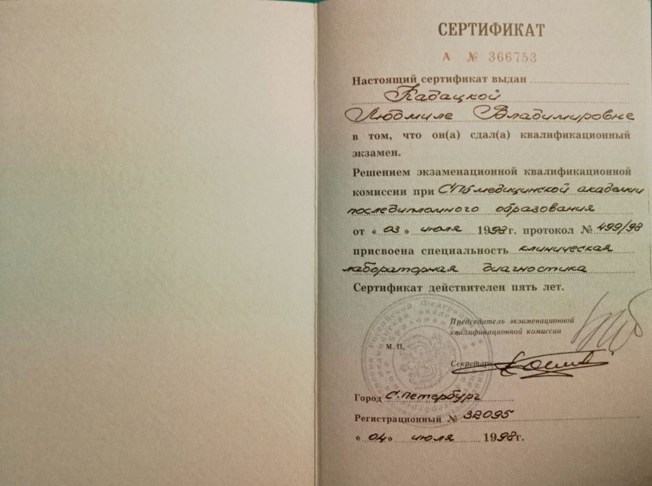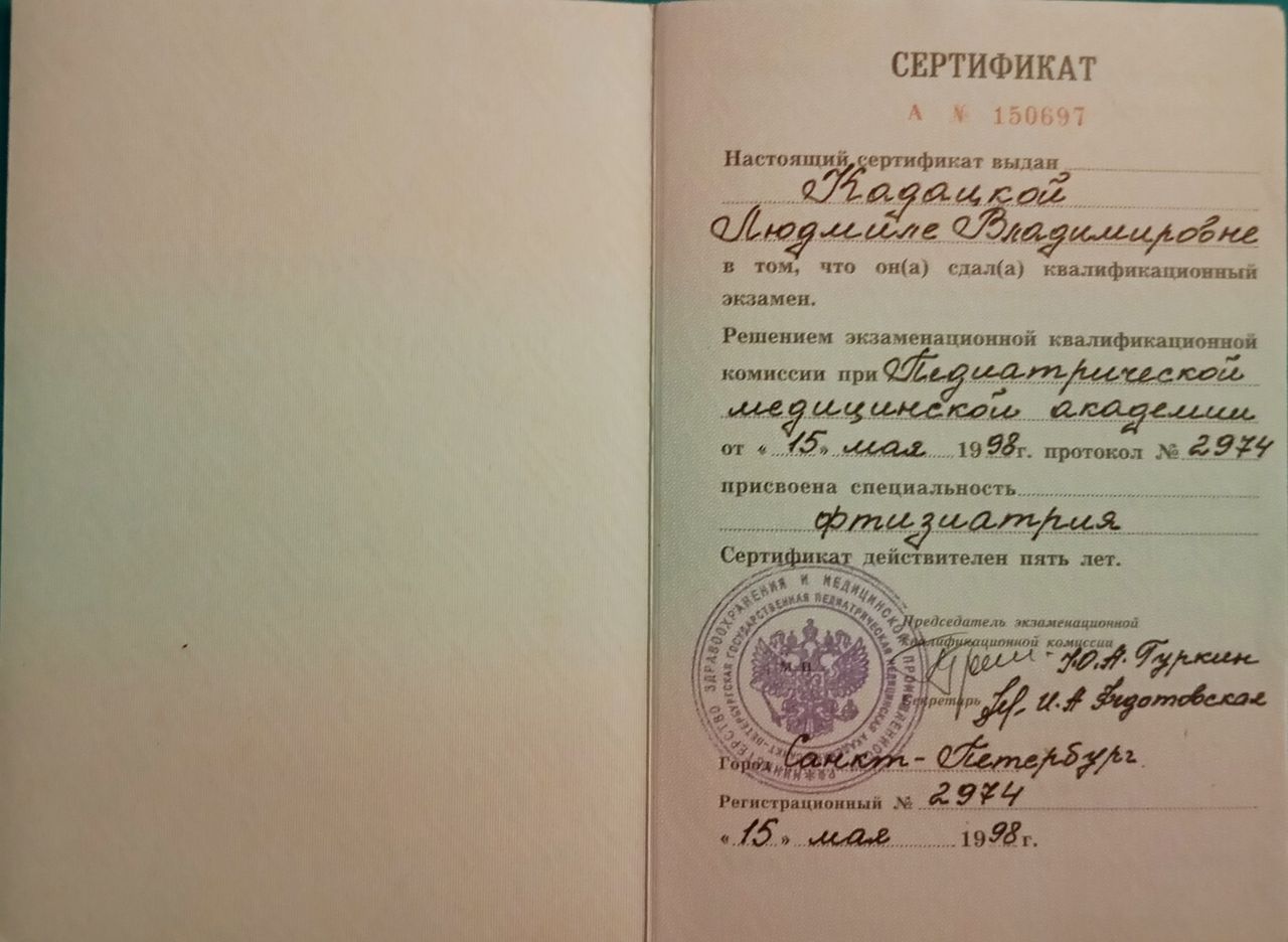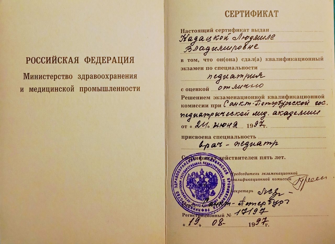 Laurea in Medicina Pediatrica presso "Università statale di Medicina pediatrica di San Pietroburgo" 1996 Specializzazione in Pediatria 1997 , Specializzazione in Laboratorio analisi cliniche e diagnostica di laboratorio 1998 MAPO SPb, Laurea in Medicina e Chirurgia presso Università di Roma "La Sapienza" 2009. Abilitazione alla professione medica presso Università di Chieti febbraio 2010 . L' iscrizione OMCEO di Pescara marzo 2010 (N°3999). 2010-2016 Medico presso il Servizio di Continuità Assistenziale ASL 2 Abruzzo, 2017-2024 Medico presso il Servizio di Emergenza Sanitaria Territoriale ASL 2 Abruzzo. Dal 2024 Medico di Medicina Generale, ASL Pescara.