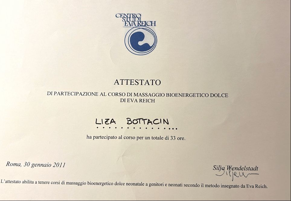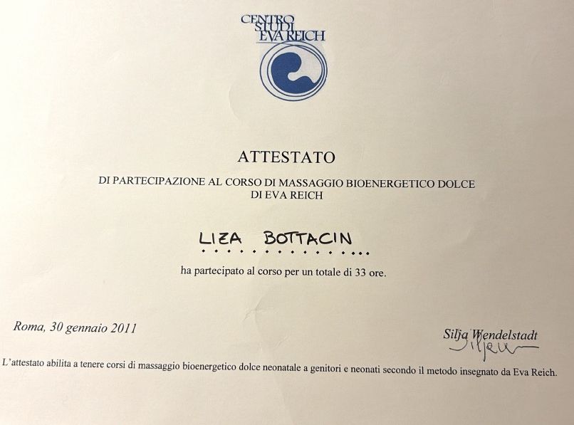 Mi dedico con passione a tutto ciò che riguarda l'inizio della vita, offrendo un prezioso sostegno psicologico alle donne in gravidanza e alle neomamme che si trovano ad affrontare le incertezze legate alla nascita del proprio bambino. Inoltre, metto in pratica e insegnò il massaggio bioenergetico dolce, un'antica tecnica che aiuta a creare un legame speciale tra mamma e bambino.