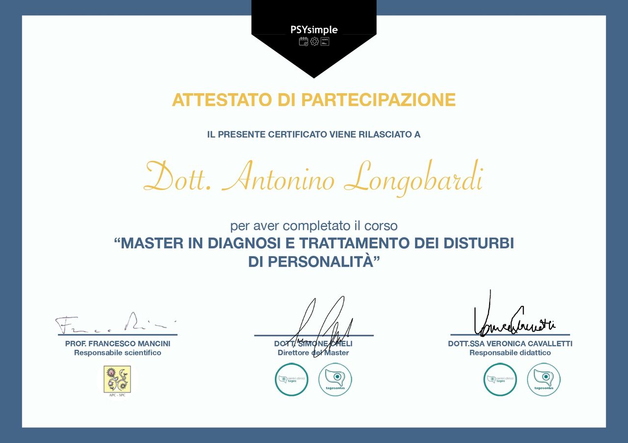Il Dr. Longobardi è una persona che sa mettere a proprio agio il paziente fin dalla prima visita. La sua professionalità e la sua empatia sono palpabili e sono qualità che difficilmente si imparano sui libri universitari. Una grande Persona e un gran Dottore, lo consiglio a chiunque abbia bisogno del supporto di un professionista serio e preparato.• Studio Medico-Psichiatrico Dott. Longobardi • prima visita psichiatrica •