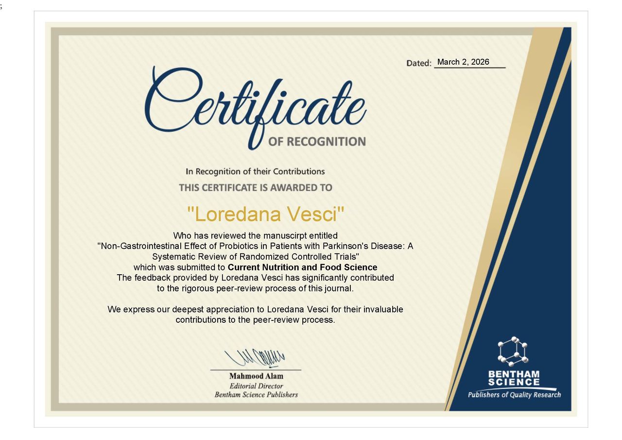 Nutrizionista, Ricercatore e Consulente Scientifico a Roma. Biologo Clinico, Dottorato di Ricerca in Scienze Biochimiche e della Nutrizione, Facoltà di Medicina e Chirurgia-Sapienza. Due Master in Dietologia e Nutrizione Clinica. Coordinatore di attività di ricerca per pazienti oncologici, con malattie gastrointestinali e metaboliche. Esperta di nutrizione, meta infiammazione, microbioma intestinale e disbiosi intestinale. Autore di 80 pubblicazioni scientifiche e altrettante comunicazioni a congressi internazionali. Ho scritto il libro "Prevenire il cancro al colon con la nutrizione". Scrivo di alimentazione e patologie correlate, vedi news scientifiche sulla nutrizione alla pagina FB nutrizionistaloredanavesci. Vedi anche sito web www.studionutrizioneroma.it