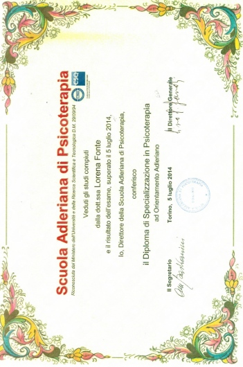 Dopo gli studi universitari ha conseguito la specialità in Psicoterapia a Torino: “Istituto Adler”. La scelta di questa scuola rispetto ad altre è stata mirata ad una formazione ad ampio raggio. Infatti, nonostante il nome "Adler", che rimanda ad un approccio psicodinamico, l'istituto ha offerto un bagaglio di esperienze e seminari che comprendono tutti gli orientamenti della psicoterapia, rendendo il professionista flessibile nella tecnica. Gli studi della Dottoressa hanno inoltre posto importanza al processo di diagnosi e all'utilizzo dei test psicodiagnostici (intellettivi, di personalità, proiettivi).