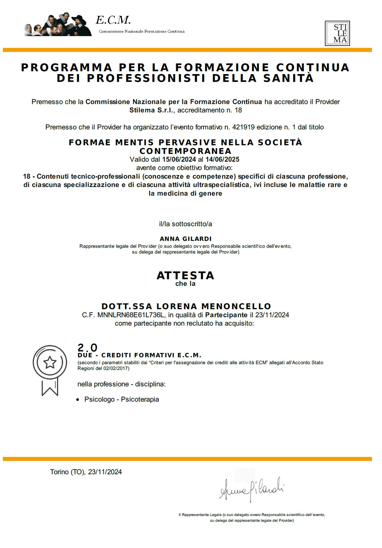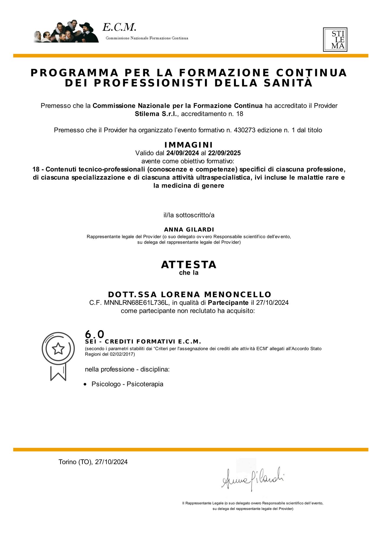 Mi trovo molto bene con la D.ssa Menoncello, per la sua professionalità e ascolto vero. Mi sa dare spunti di riflessione interessanti e utili al cambiamento positivo.