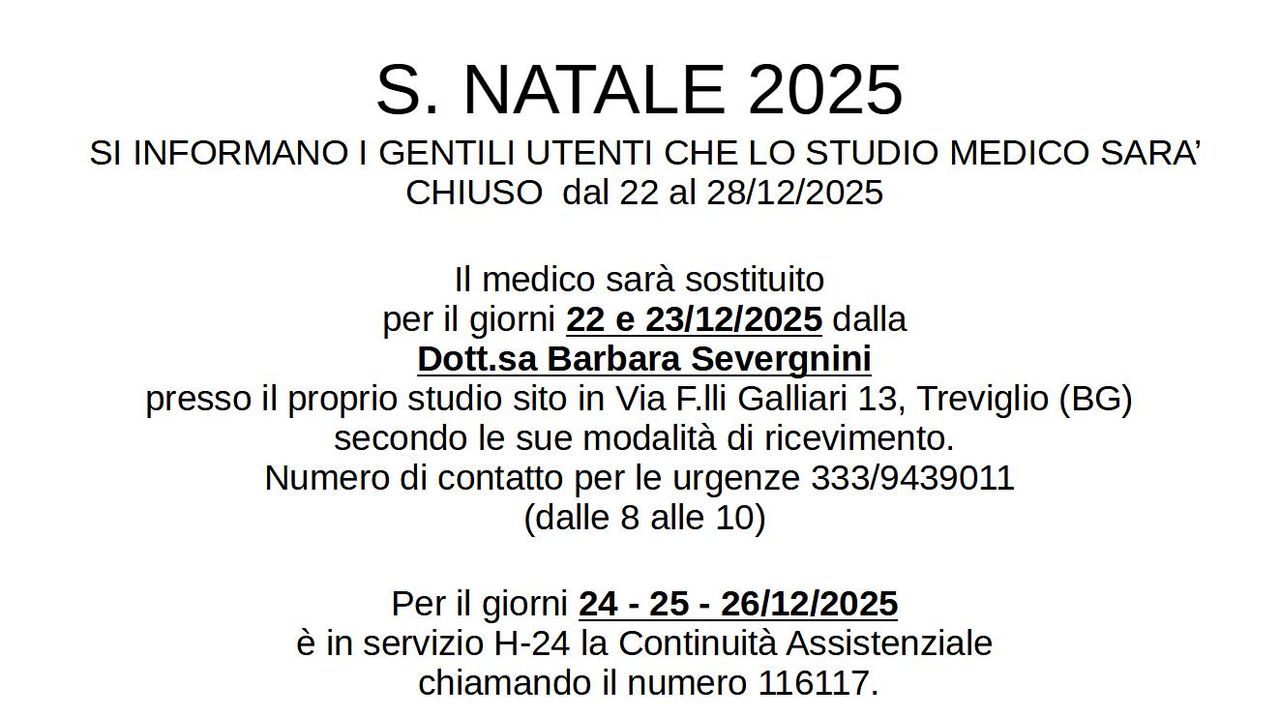 Gli ultimi 30 minuti di attività ambulatoriale (LUN e MER dalle 12.30 – MAR dalle 18.30 – GIO dalle 17.30 e VEN dalle 11.00) saranno dedicati al solo rilascio dei CERTIFICATI DI MALATTIA INPS senza necessità di prenotazione.