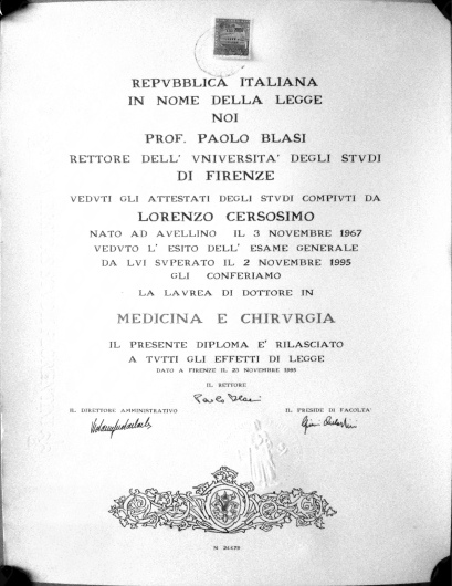 Dopo aver conseguito la Laurea presso l'Università degli Studi di Firenze, frequentando l'Accademia di Sanità Militare Interforze e il Policlinico Universitario di Careggi, ho svolto per un periodo l'attività quale Dirigente del Servizio Sanitario di Reggimento e di Brigata presso la cittadina di Portogruaro in Veneto.