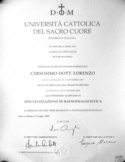La vita personale e militare mi ha infine portato nella Capitale, dove ho potuto frequentare, presso l' Università Cattolica del Sacro Cuore, la mia specializzazione in Radiodiagnostica con sede nel Policlinico Universitario Agostino Gemelli.