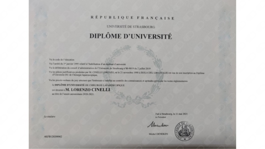 Dal 2020 al 2021 ha svolto una Research Fellowship presso l’Istituto di Ricerca contro il Cancro dell'Apparato Digerente (IRCAD) di Strasburgo, durante la quale ha approfondito il tema dell'Optical Imaging e l'applicazione di nuove tecnologie in chirurgia addominale.