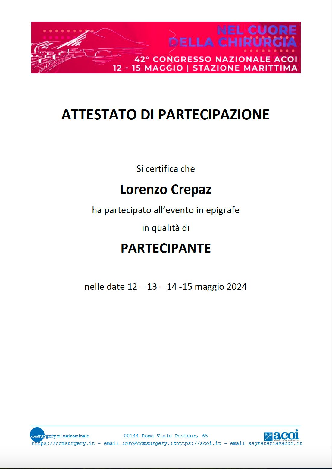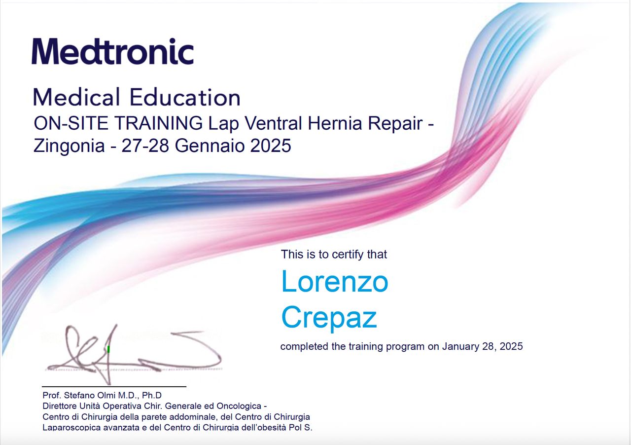 Mi sono laureato in Medicina e Chirurgia e poi specializzato in Chirurgia Generale all’Università di Verona. Ho poi approfondito la Chirurgia della Parete Addominale con un Master Universitario di II livello, e completato le Scuole Nazionali di Chirurgia Proctologica e del Pavimento Pelvico, e quella di Chirurgia Colorettale.