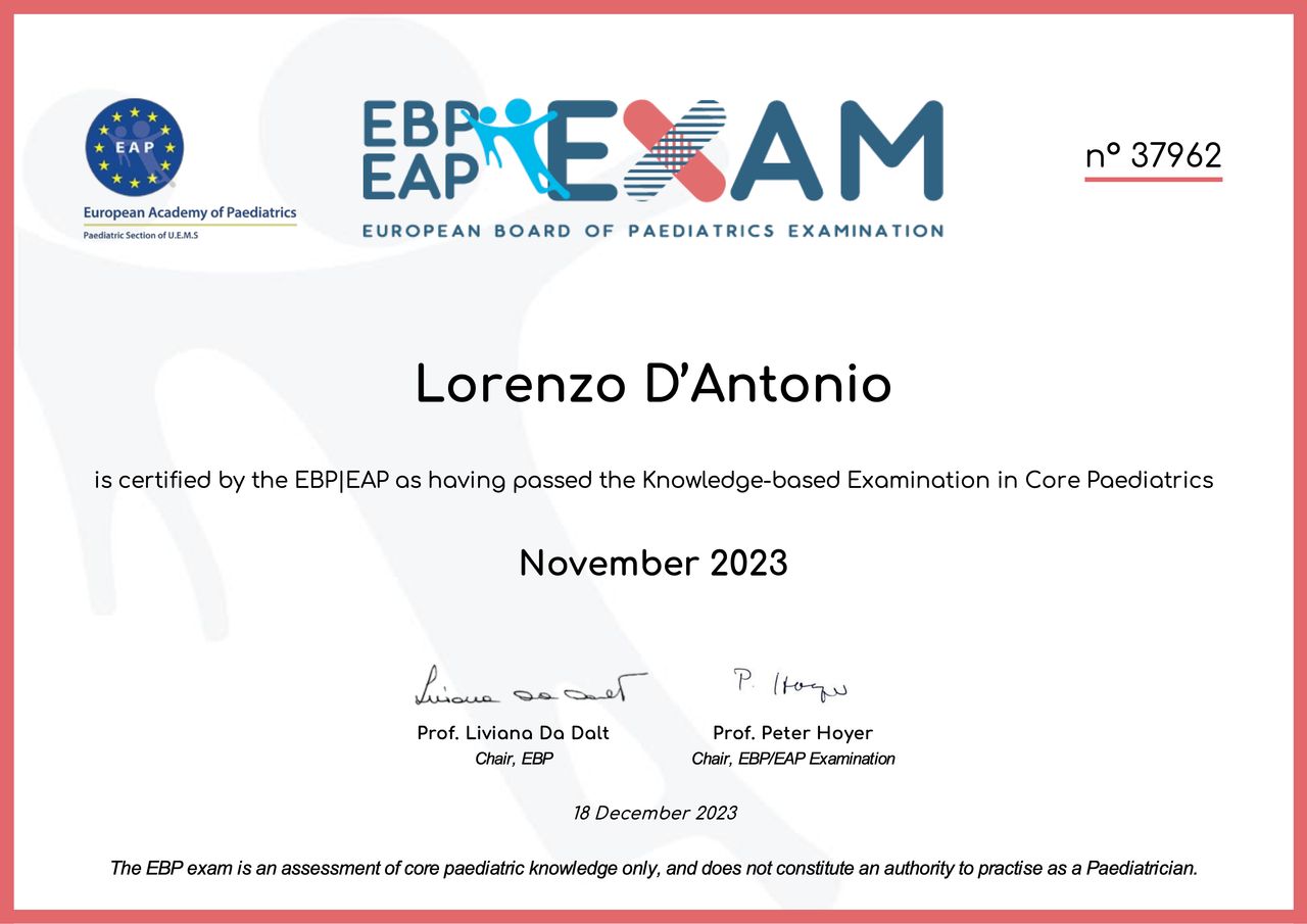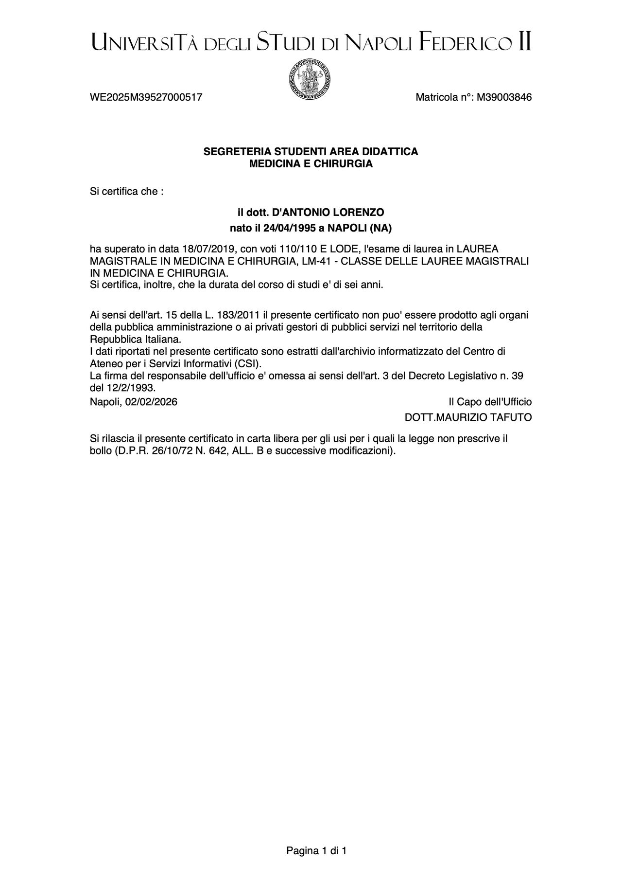 Sono il Dott. Lorenzo D’Antonio, Pediatra, laureato in Medicina e Chirurgia presso l’Università degli Studi di Napoli "Federico II" con 110 e lode e specializzato in Pediatria con il massimo dei voti (50/50 e lode).